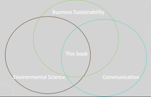 Above is a visual for how concepts in each chapter will be integrated: Environmental Science is in one circle. Business Sustainability is in another circle overlapping the previous one. Finally Communication is in another circle overlapping the other two. This Book is in the middle, implying that it will integrate the three fields of study: environmental science will be “what” students will communicate, business sustainability is the “why”, and communication is “how”. Students will write, discuss, present, and show designs of their understanding of terms to foster discussion of issues, brainstorm ideas, and develop stronger writing, speaking, and persuasion skills in the meantime.