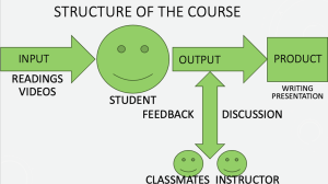 Above is a figure of how this course will be structured. An arrow saying “input” is pointing toward a smiling face labeled “student”. Examples of input include readings and videos. These are where the student will acquire terminology of environmental science and business sustainability. Another arrow is pointing away from the student labeled “output”. Other arrows are pointing at this arrow. This two-way arrow is labeled “feedback” and “discussion”. Classmates and instructor are on the other side of the two-way arrow. The output arrow is pointing toward a box labeled “product.” Examples of the product that students may be creating include “writing” and “presentation”.Although students may take quizzes, the bulk of the course is on what the students will create with the knowledge they gain from the readings. Thus, each chapter will end with discussion questions, writing tasks, and ideas for assignments that could include class discussion or presentations.
