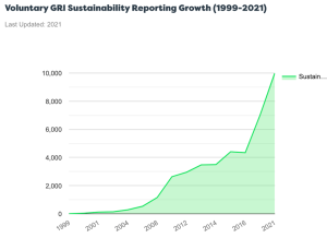 The chart below shows voluntary GRI sustainability reporting growth from 1999-2021. It increased significantly in 2008, then continued to rise steadily, then starkly in 2021.