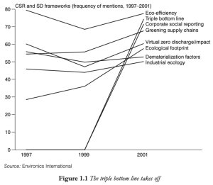 Since 1999, as shown in the chart below, the mention of specific words such as “eco-efficiency” and “triple bottom line” have increased in mentions on CSR reports.