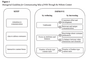 The left side is a circle that says “keep” and inside it is “attention to communication,” “aim to inform customers,” and interactive content forms.” On the right is a circle that says “improve” and below is “by reducing” and “by increasing.” Under “improve by reducing,” there is a box that says “uniformity,” pointing to “consistent effort and development” and the other arrow points to “relevant and unique communication.” Another box under “improve by reducing” says “focus on attributes and features.” It points to “knowledge about customer preferences” and “a balance between value dimensions and elements.” The last box says “improve by reducing” then “number of brick-type content unites” pointing to “by increasing the number of feather-type content units.”