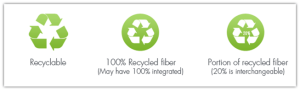Businesses can communicate their paper waste management by discussing initiatives to decrease paper consumption, such as implementing digital solutions and encouraging double-sided printing. Additionally, promoting the recycling of paper products and using recycled paper in operations can be effective. Sharing success stories and metrics about reduced paper waste can help engage stakeholders and demonstrate the company’s commitment to sustainability. Below is an image of labels that a product may have to show that it is recyclable, made of 100% recycled fiber, or a percentage of recycled fiber: