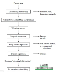 In 2022, the UN Institute for Training and Research (UNITAR) released its most recent Global E-garbage Monitor, which showed that the globe produced a record 62 billion kilos of electronic garbage, or e-waste. This is to an average of 7.8 kg per people per year and an 82% increase from 2010. Only 22.3% of the entire amount of electronic garbage created in 2022 was officially collected and recycled in an ecologically responsible way. That is a nearly five-fold increase in e-waste creation compared to the growth in organized recycling. By comparison, e-waste recycling is a multifaceted process that includes physical sorting, dismantling and shredding to eliminate hazardous materials, inspecting electronic equipment for working components, and separating metals from non-magnetic materials. Expert laborers are essential to guaranteeing the secure and effective functioning of the recycling procedure. While non-magnetic minerals are separated using water based on their respective densities, valuable metals are separated using magnets and mechanical processing. To recover any valuable elements that may still be present in the plastic components, a last inspection is carried out before the recycled materials are sold. [14]