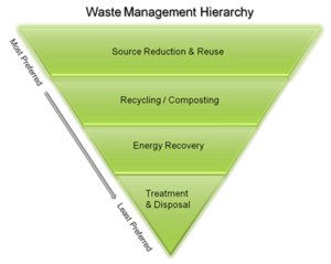 EPA continues to assess the waste hierarchy to see whether any adjustments should be made based on recent statistics and information. Below is an inverted pyramid with “source reduction and reuse” on top, then “recycling/composting,” “energy recovery,” and then “treatment and disposal” on the bottom.