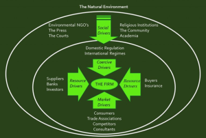 - The concentric circles and arrows illustrate that the firm is at the center of a network of influences from various drivers categorized into social, coercive, resource, and market factors. Each category influences the firm’s operations and decision-making processes within the context of the natural environment.