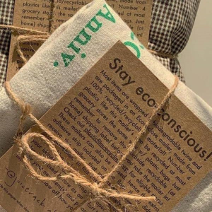 Below is an image of a note that was included in someone’s package that says “stay eco-conscious!” with other information in smaller text on how and why.