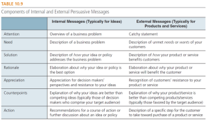Cardon (2018) outlines the components of internal and external persuasive messages with similar components [24]: