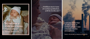 This image has three panels. The first on the left has a baby being held by a mother, and the text in pink, “By the time a child born today takes their first breath…” The second panel in the middle shows the mother and baby with grey text on a darker background, “9 billion more tons of carbon pollution will be in the air.” The final panel on the right has a factory building with smoke filling the air and pink text saying “Last year more than 40 billion tons of carbon pollution was released into the atmosphere” with “World Meteorological Association” as its source.